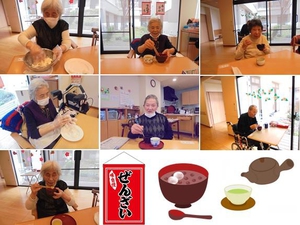 2021.02.08 豆腐白玉ぜんざい-ショートステイ-[1月26日-27日] 豆腐を使って白玉団子を皆さまと一緒に作り、ぜんざいを召し上がっていただきました。「豆腐で白玉団子作れるなんてすごいね」、「ぜんざい美味しいわぁ」などお言葉をいただき、喜んでいただけたようです。 前の記事 次の記事