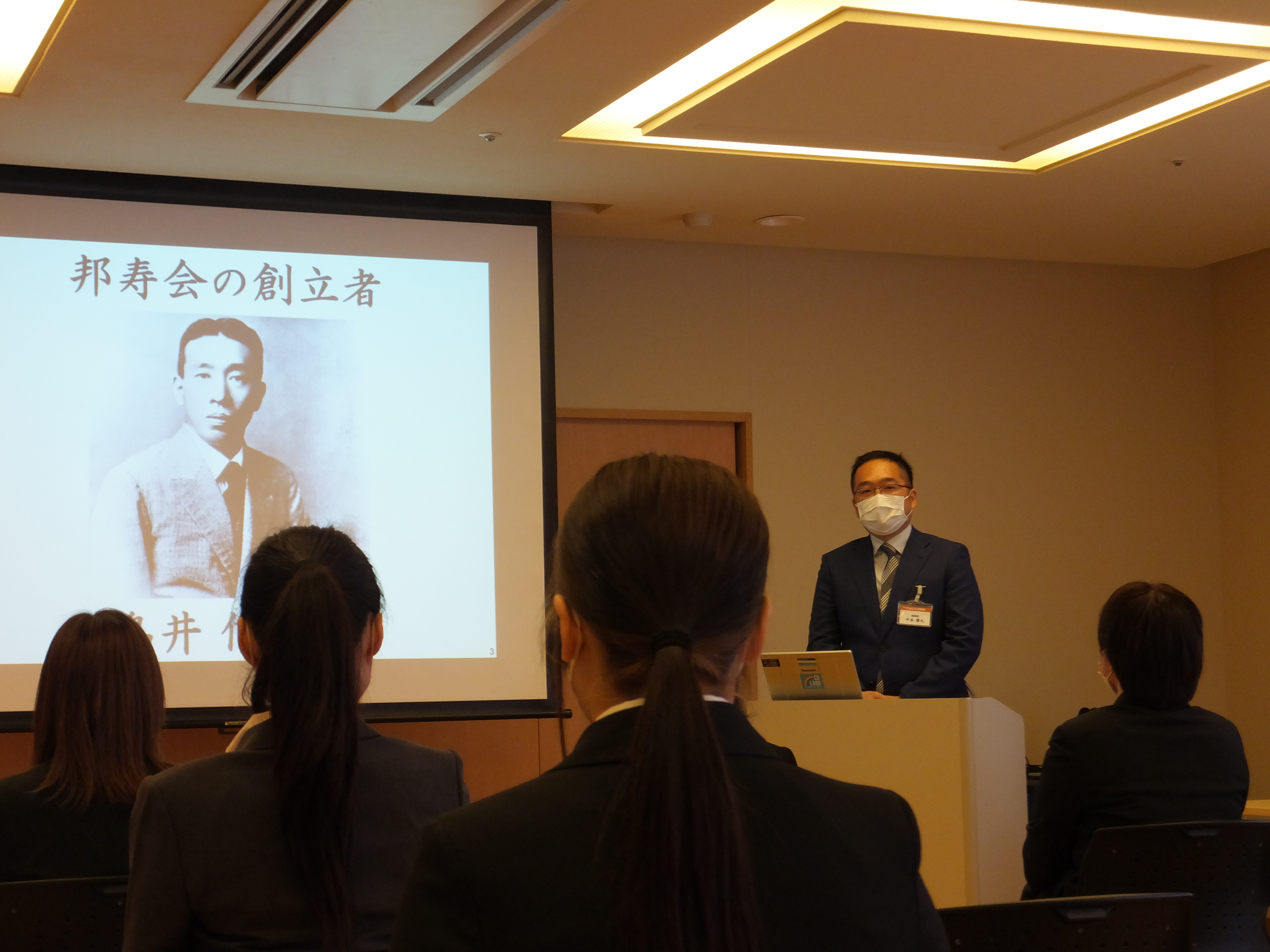 式典では、羽柴会長より祝辞と邦寿会理念の説明、各施設長より歓迎の挨拶の後、「邦寿会の歴史」、「サントリーグループのCSR活動」について学びました。