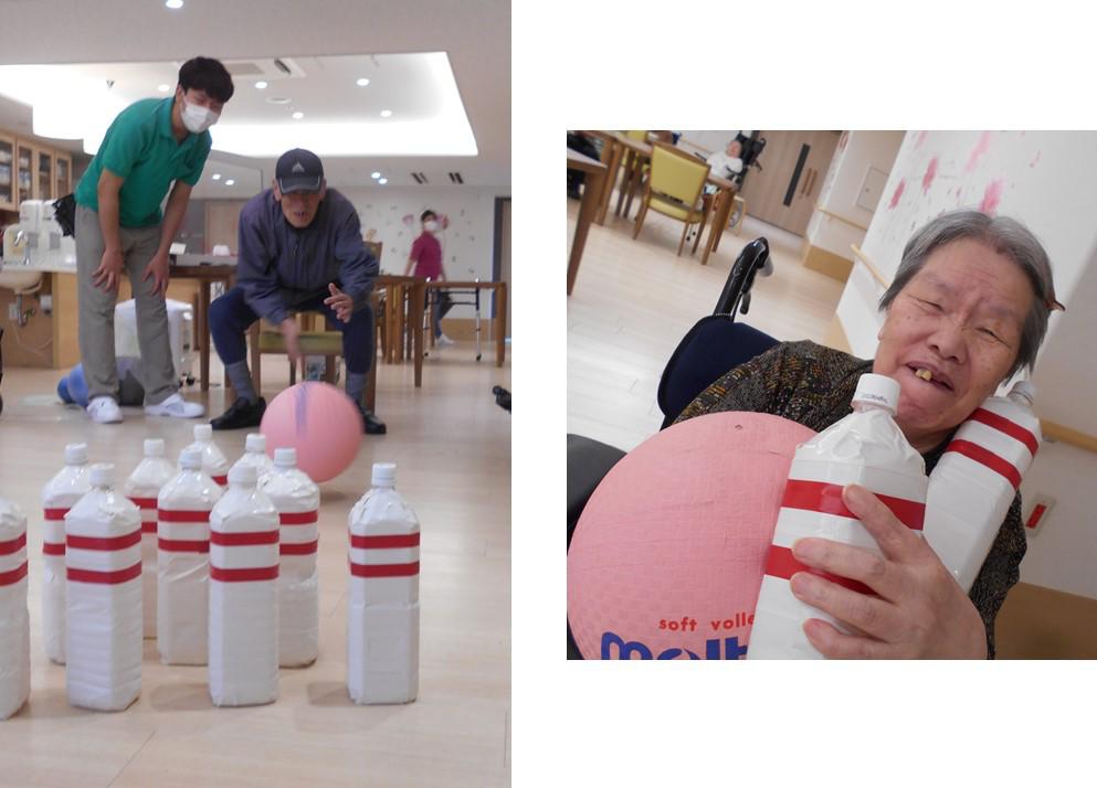 2021.07.18 ボウリング大会**藤ユニット** 今日はユニットでボウリング大会を開催しました。ピンは職員の手作りです。チーム対抗戦ということで、「頑張ってや!」と応援もしながら楽しんでくださいました。ボウリングは初めてという方も、とても上手に倒しておられました。もちろんストライクも出ました!ボウリングでいい汗をかいた後には、夏にピッタリの水羊羹をお出ししました。「冷たくて美味しいわ」と仰ってくださいました。 前の記事 次の記事
