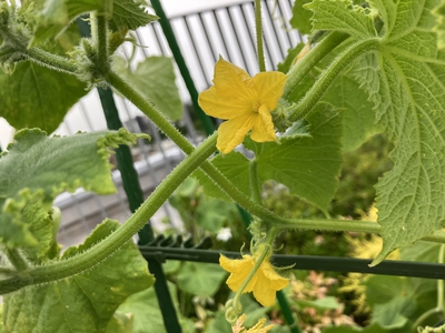 きゅうりとピーマンがうまく育って収穫が始まりました。天気の良い日に外気浴と収穫を楽しんでいます。先週までのきゅうりは地面に近くて曲がっていましたが、最近はつるがうまく添え木にまきついて、まっすぐなきゅうりができるようになりました。