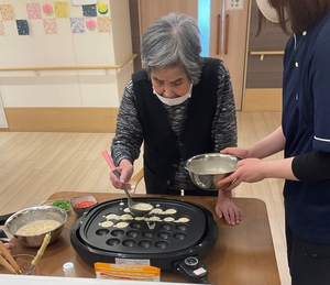 みなさんが召し上がっている間、職員がお隣のユニットにおすそ分けしようと焼いていると、「私もやるよ」と手伝ってくださいました。何回もピックでくるくるたこ焼きをひっくり返して「あー、疲れた、やれやれ」とおっしゃいながら、ニコニコと楽しそうでした。