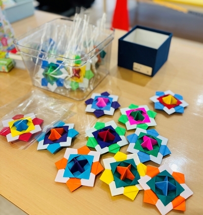 今回のおもちゃコーナーには、スタッフ手作りの折り紙のコマが登場!回すと色鮮やかで小さなお客様たちは大喜び!