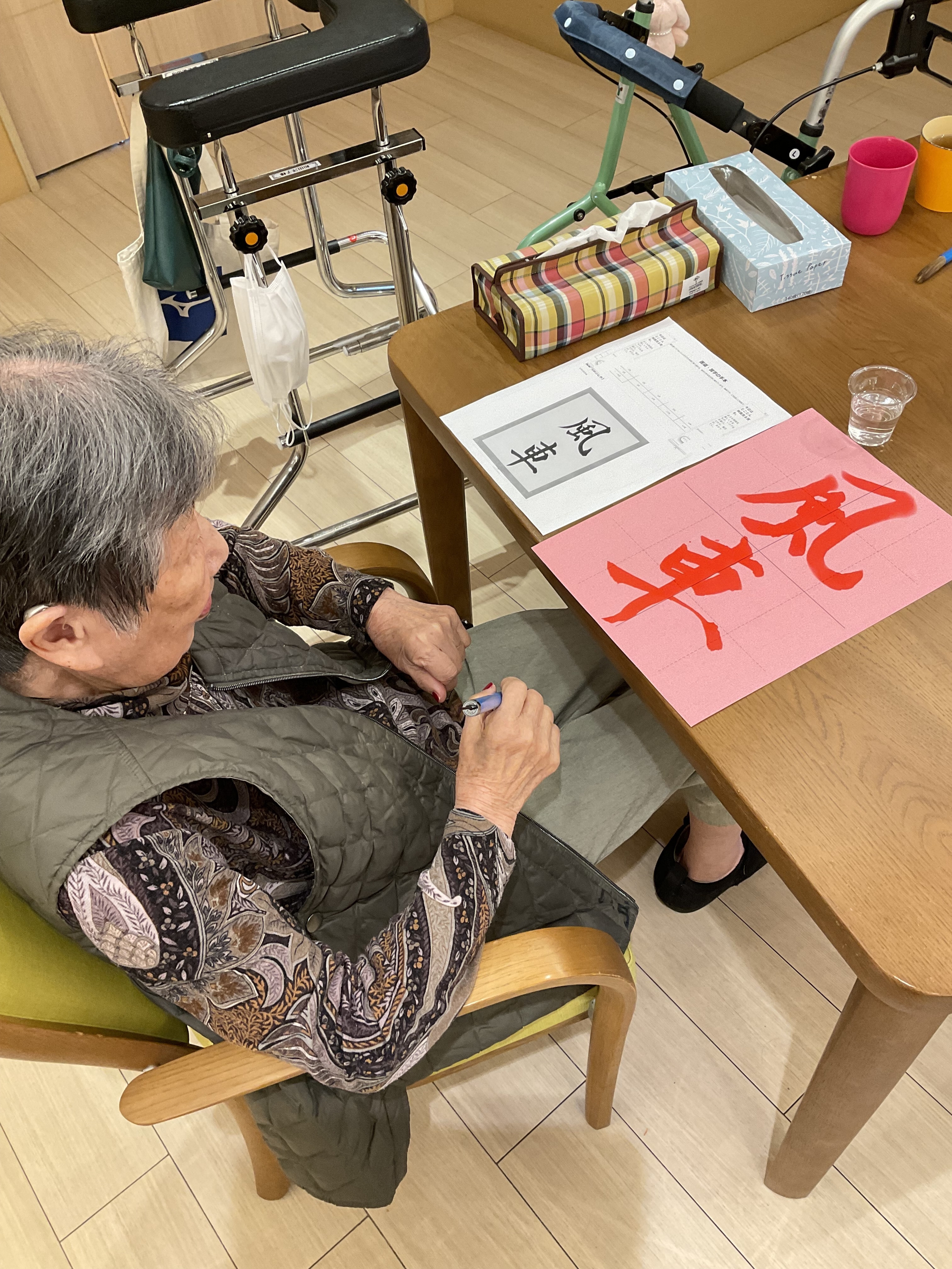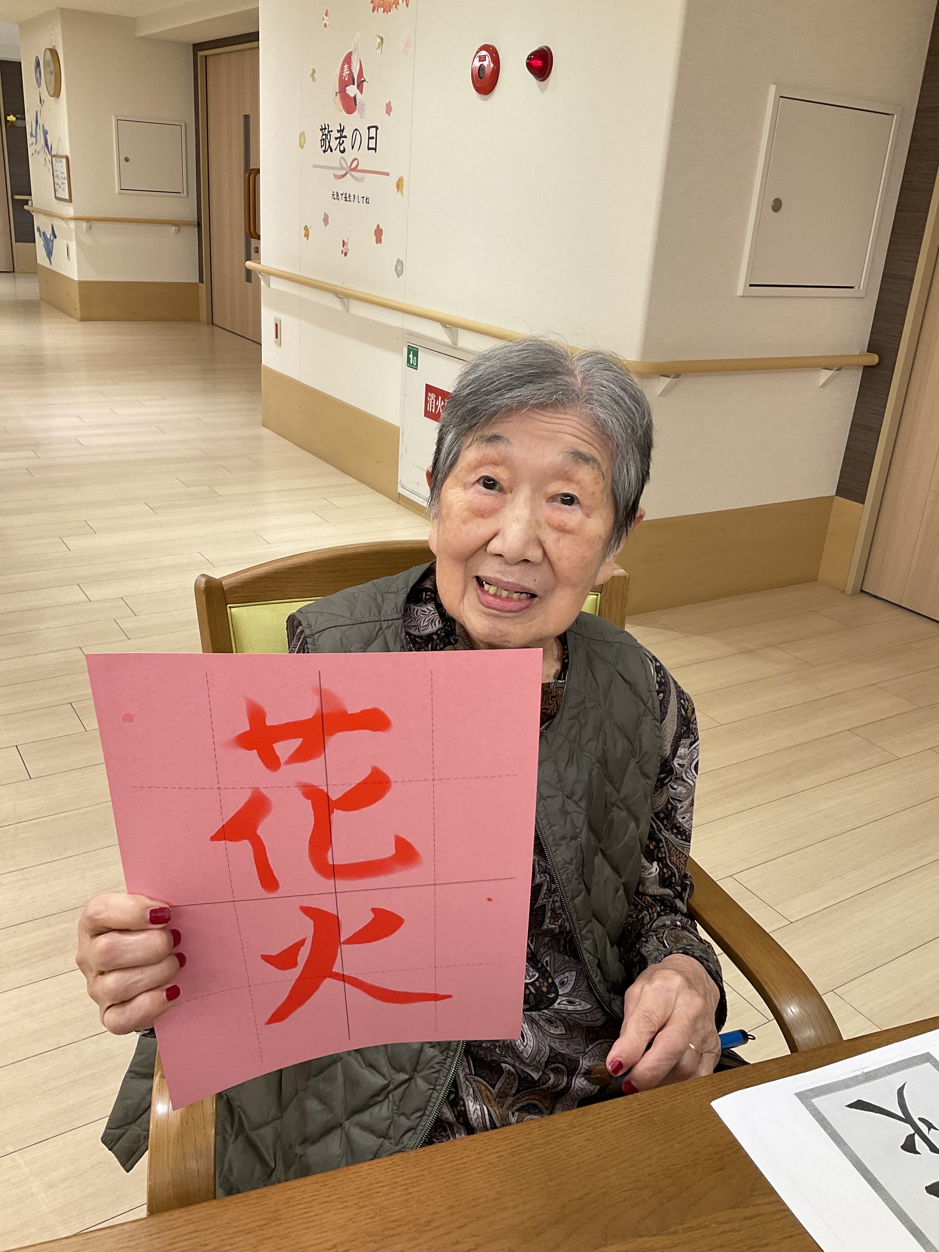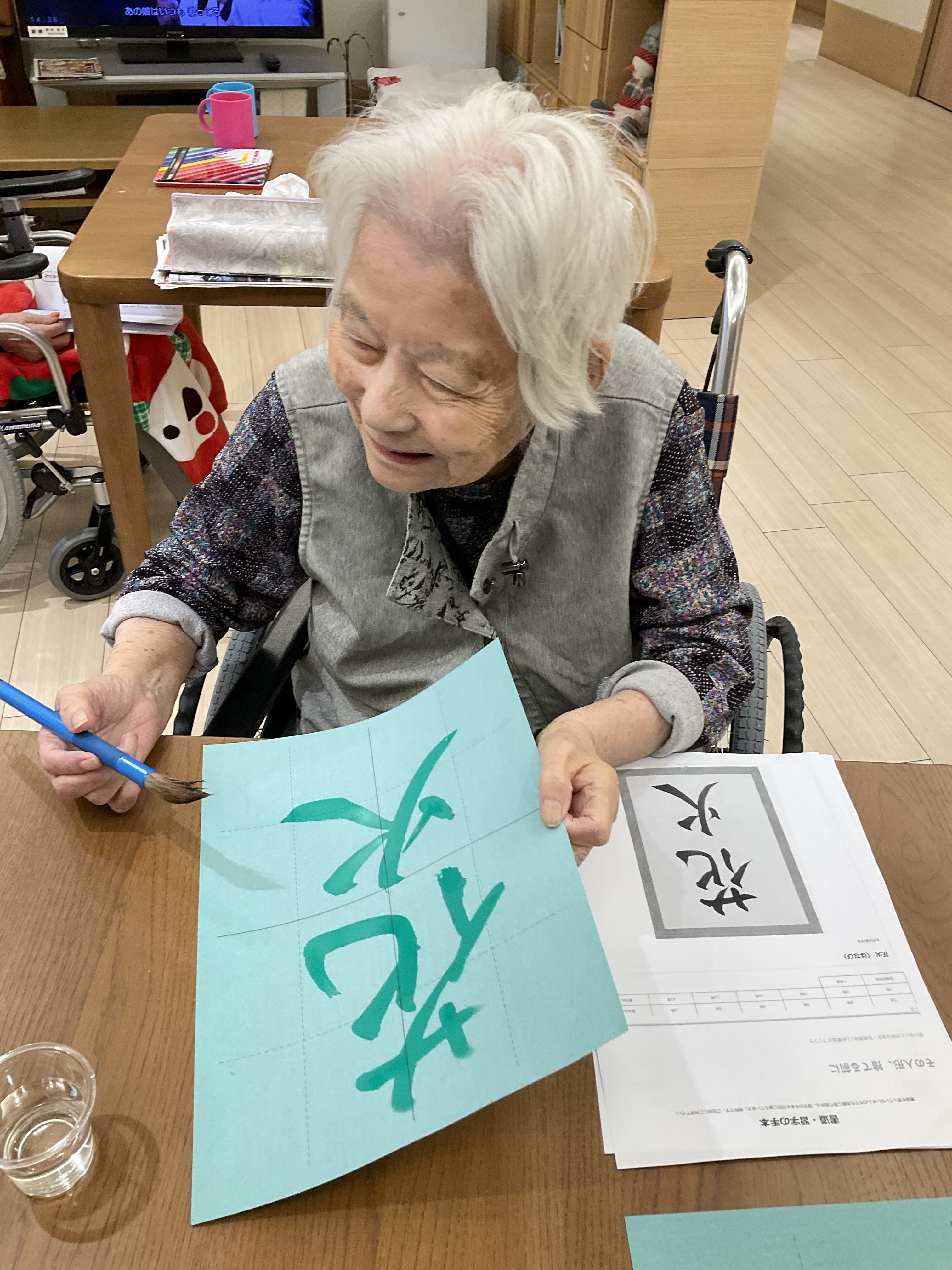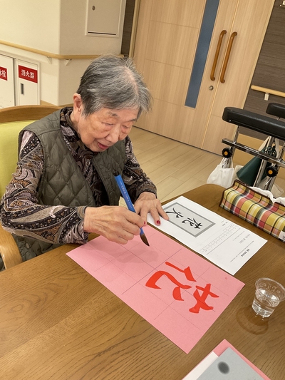 習字に取り組みました。普段なかなか字を書く機会のない方も「わたしもやってみるわ」と筆を持たれました。みなさん本当に上手に書かれており、満足感そうに笑っていらっしゃいました。