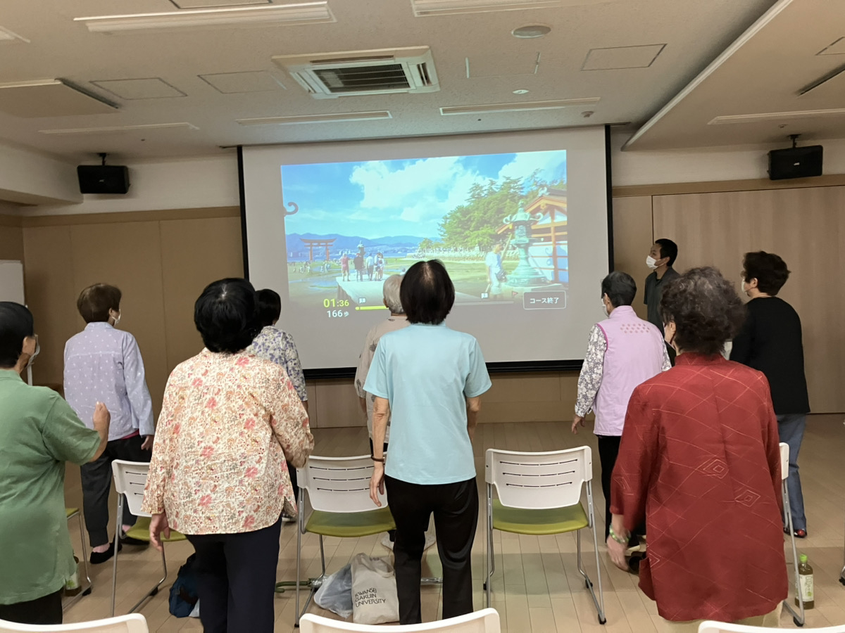 講義のあとは、デイサービスで活用している「テレさんぽ」を体験していただきました。「テレさんぽ」は、センサーを身に着けて歩くと、大きな画面に映った風景も一緒に動いてくれるもので、あたかもその風景の中を実際に散歩しているような体験ができます。