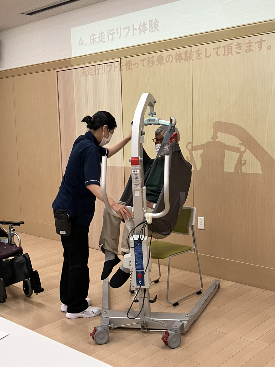 高殿苑の取り組みの一環である「抱え上げない介護」で使用している床走行リフトを体験いただきました。